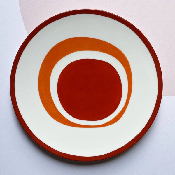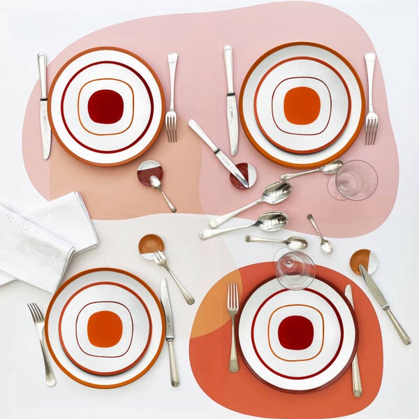 une assiette Mandarine graphisme B + une assiette Mandarine graphisme A + une assiette Brun roux graphisme A + une assiette Rouge automne graphisme B