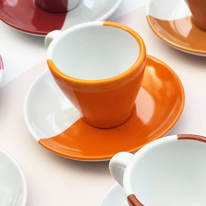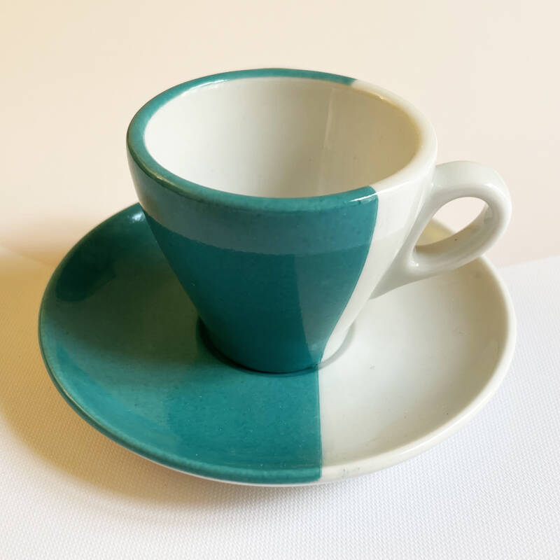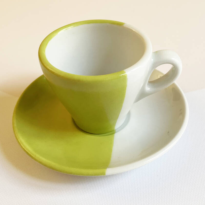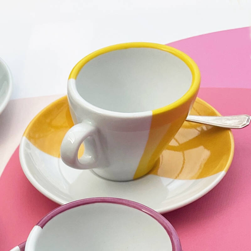 Chaque tasse et soucoupe sont peintes à la main et cuites à l'atelier